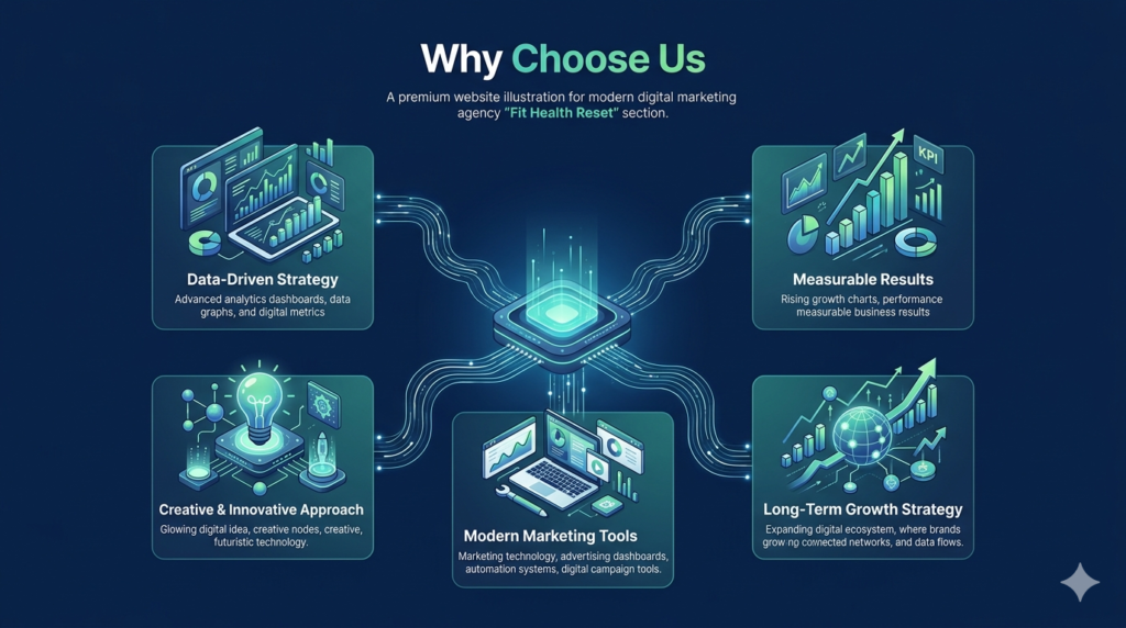 Fit Health Reset olaraq missiyamız brendlərin rəqəmsal mühitdə daha sağlam, davamlı və ölçülə bilən inkişaf əldə etməsinə kömək etməkdir. Biz müasir rəqəmsal marketinq strategiyaları, data əsaslı qərarlar və kreativ yanaşma ilə bizneslərin hədəf auditoriyasına daha effektiv çatmasını təmin edirik. Məqsədimiz hər bir layihədə real nəticələr yaratmaq və müştərilərimizin rəqəmsal inkişafına uzunmüddətli töhfə verməkdir.